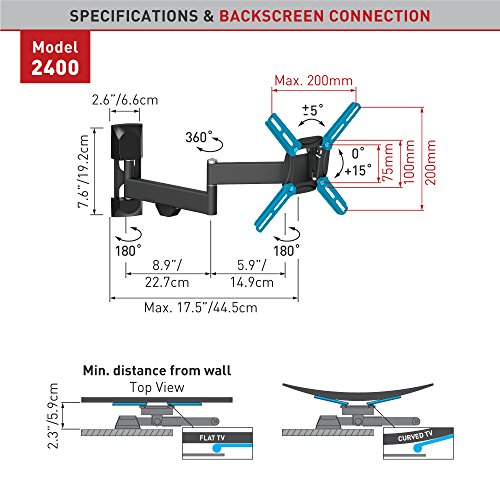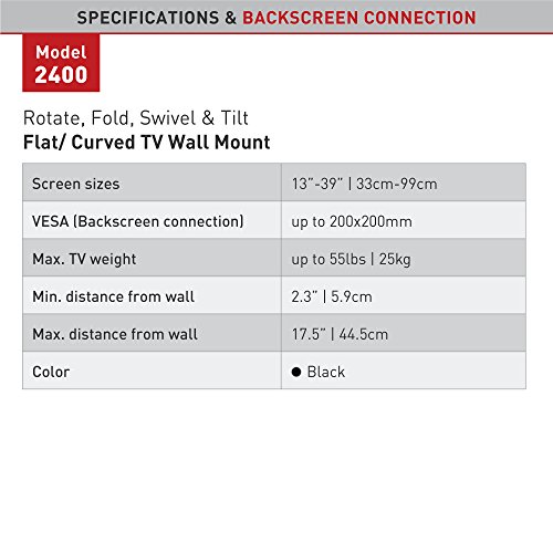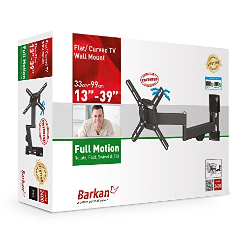 -. Binding : Electronics -. Brand : Barkan -. Color : Black -. EAN : 0818212001384 -. Feature : Patented mechanism to fit both flat and curved screens / Wide range of viewing angles for various sitting positions / Low profile in closed position / Cable management clip holds the cables together / Fall proof inner structure prevents disengagement of the screen. -. Label : Barkan USA Inc -. Manufacturer : Barkan USA Inc -. Model : 2400.B -. MPN : 2400.B -. NumberOfItems : 1 -. PackageQuantity : 1 -. PartNumber : 2400.B -. ProductGroup : Home Theater -. ProductTypeName : AV_FURNITURE -. Publisher : Barkan USA Inc -. Size : 39.0 -. Studio : Barkan USA Inc -. Title : Barkan TV Mount Television Mount Black (2400.B) -. UPC : 818212001384 -. Warranty : Lifetime