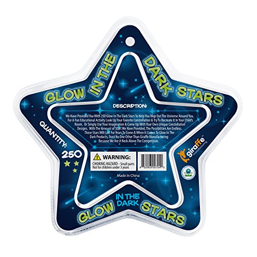 Studio : Giraffe Manufacturing Publisher : Giraffe Manufacturing Binding : Kitchen Product Description Our Stars Brightly Glow In The Dark! Make A Glow In The Dark Star Ceiling In Your Child's Room. You Can Make Constellations With The Glow In The Dark Mini Stars Or Recreate The Big Bang With A Glow In The Dark Star Explosion. Use Our Glow In The Dark Star Sticker Backings To Ensure They Stay In Place. Glow In The Dark Parties Supplies For Glow In The Dark Theme Party. These Are Out Of This World Glow In The Dark Decorations That Go Well With Glow In The Dark Party Favors Or Other Glow In The Dark Stuff. Check Out Our Other Glow In The Dark Products As Well. You Can Add Glow In The Dark Sticks Bracelets To Your Party Or Holiday Celebration. Decorate Your Child's Birthday Party Then Hand Out Our Glow In The Dark Party Favors Dress In Our Glow In The Dark Jewelry. As You May Guess, Giraffe Manufacturing Has Very High Standards. As A Consumer, You May Think Wanting Quality Products At A Reasonable Price Is A Tall Order But For Us Tall Comes Natural. Other Companies Claim To Have Long Lasting Glow In The Dark Stars With Chemicals Like Glominite. We Have Tested Our Stars Against The Competition We Are The Best. We Stand Tall Behind This Claim. In Fact We At Giraffe Manufacturing Will Stick Our Necks Out To Ensure Your Satisfaction. If Our Product Doesn't Meet Your Expectations, We Will Make It Right. 0