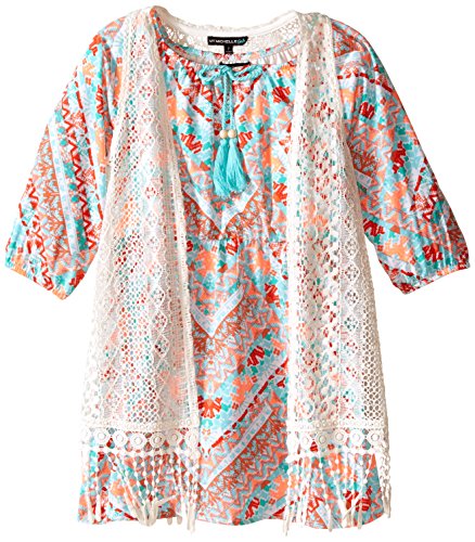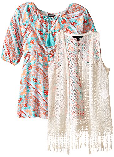 3/4 sleeve printed peasant dress with crochet vest with fringe