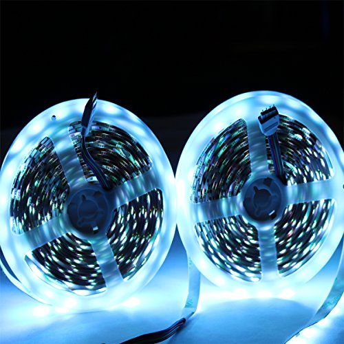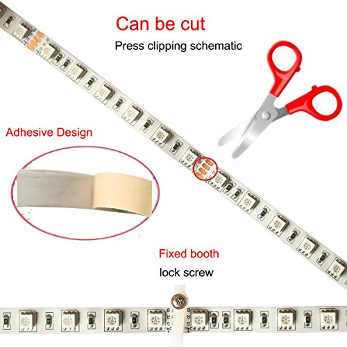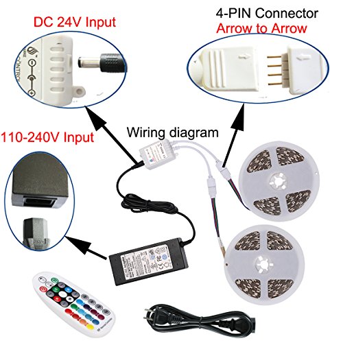 The 5050 LED is most commonly used on LED tapes with 60 LEDs per metre, 60 of these LEDs p/m will produce a Lumen output of around 600-720(depending on the colour), giving a smooth, bright effect when shining onto a surface. Available colours for the 5050 LED strip SMD include warm or cool white, also an RGB (red, green and blue). Application Indoor decoration:Kitchen,Diningroom,Bedroom,Garden,Porch,Under cabinet,Patio,Balcony,Hotel etc. Festival and Events: Christmas, Wedding and Parties etc. The most common applications for a 60SMDsp/m 5050 LED strip are as general lighting, such as corridor lighting,replacing fluorescent tube lighting, in homes, bars, restaurants and hotels etc. New and Unique RF Controller 360 degrees sensor makes operation easiereven if there are obstacles Voltage: 12V-24V DC Control Distance: More than 20 meters(don't need certain degree to aimed at the RF receiver) Max output current: 6A Maximum output power: 72W Remote controller dimension: :L 110 * W50*H 15mm Strip lights LED: 600 LEDs Length: 2X16.4ft =32.8ft Voltage: 24V DC Color: RGB Luminosity: 6000-7200LM Work temperature: -20 to 60℃ Waterproof: IP20(Non-waterproof) Lifespan: more than 100,000 hours UL listed Power supply Output: 24V DC Output current: 2A Input Voltage: 100 - 240V AC Power consumption: 48W Adapter dimension: 120x 50 x 30mm