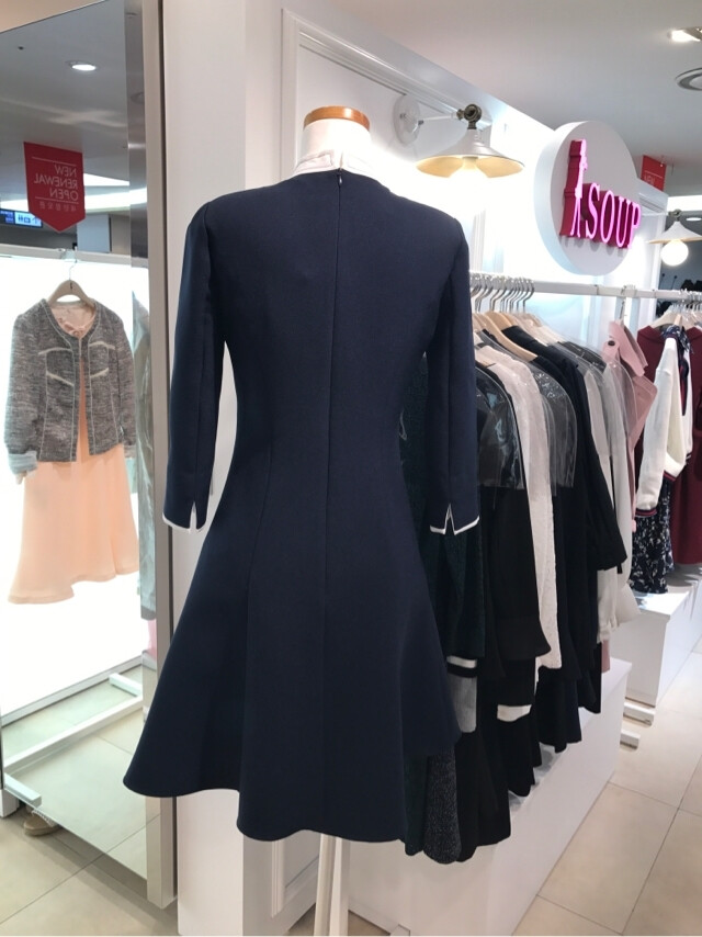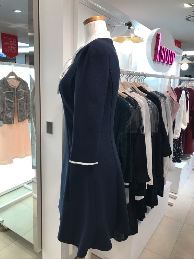칠부 소매로 가볍게 입기좋고 허리라인을 잡아주어 날씬한 스타일의 플레어 원피스입니다