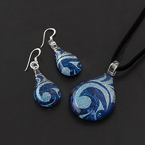 -. Title : 925 Sterling Silver Hand Blown Murano Glass Blue Sea Wave Silver Glitter Dangle Earrings