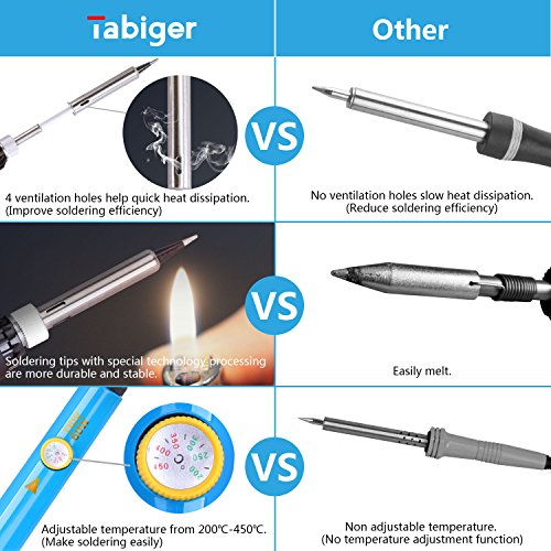 【HEAT UP QUICKLY and HEAT DISSPATION EFFICIENCY】 -60 watts, upgrade PCB'A, we use the Chip Fixed Resistor while others on the market use the Color ring resistance, heat up quickly(2 minutes or so). Adjustable temperature with thermostat range 200~450℃. With our upgrade steel-pipe design, the soldering iron is more efficient in a better heat dissipation.