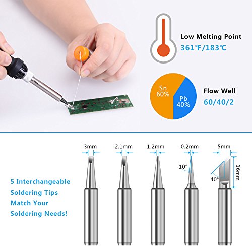 【16-in-1 Soldering Iron KIT】 - Soldering iron kit comes with soldering iron(with 1.5m power cable), solder wire, desoldering pump, solder wick, stand with cleaning sponge, 5 multiple soldering tips, 2 anti-static tweezers, rosin (solder paste), copper wire, scissors, screwdrivers(electric pen), insulation tape, knife and a hard carry case to meet all your soldering project needs.