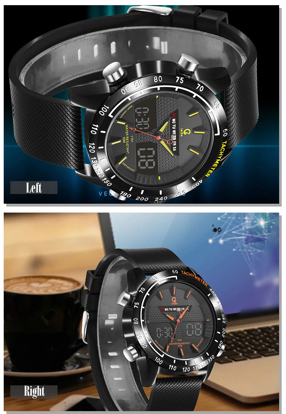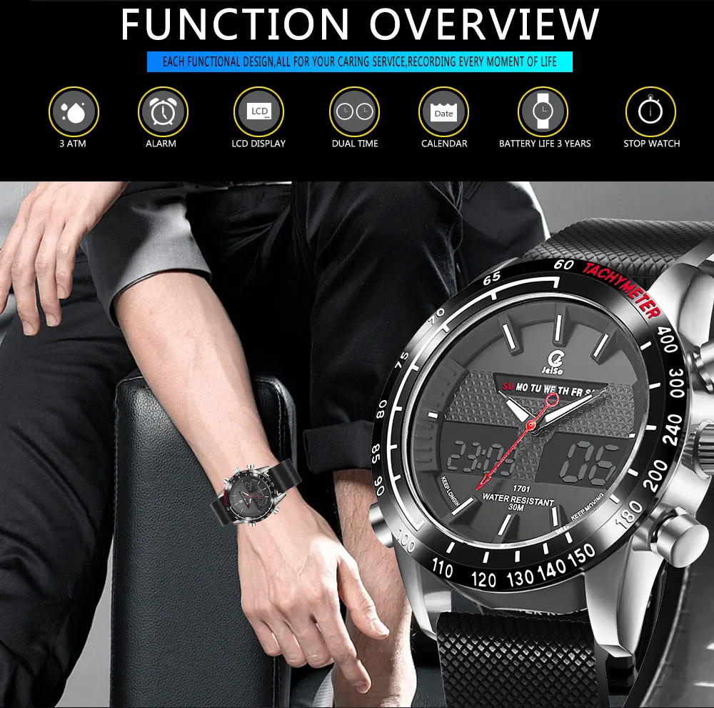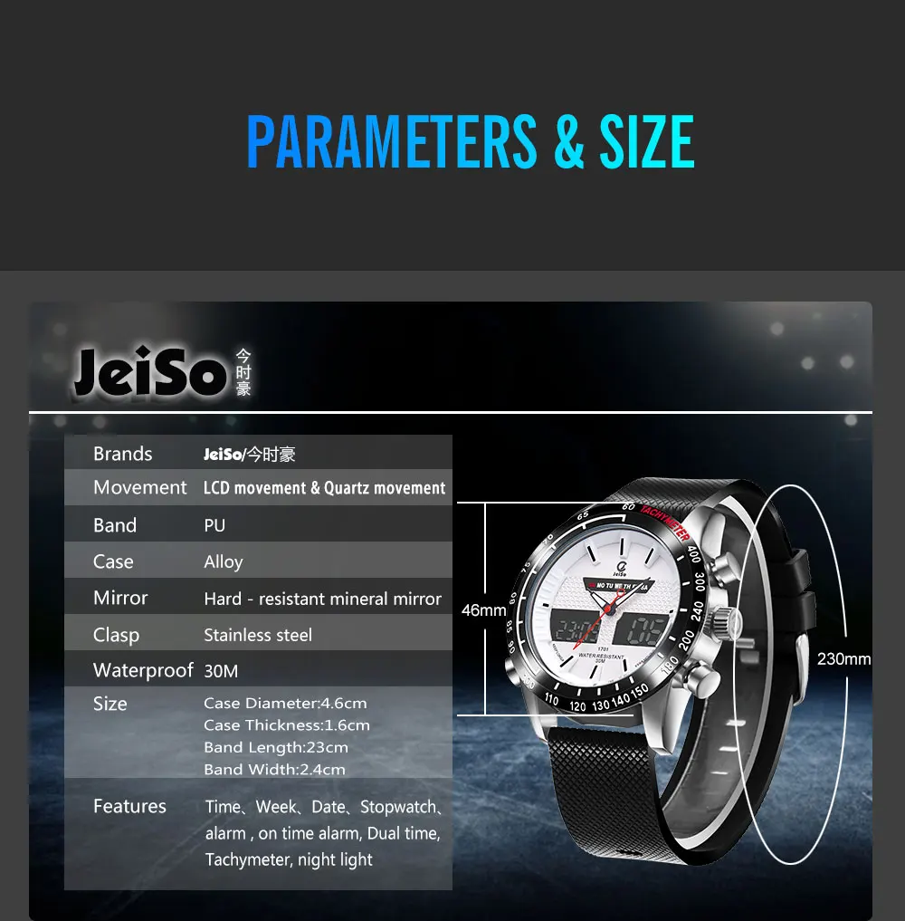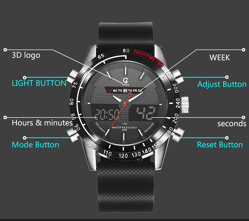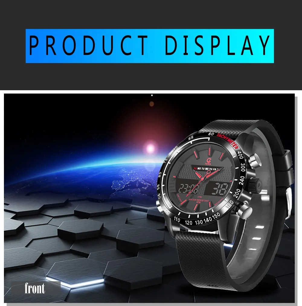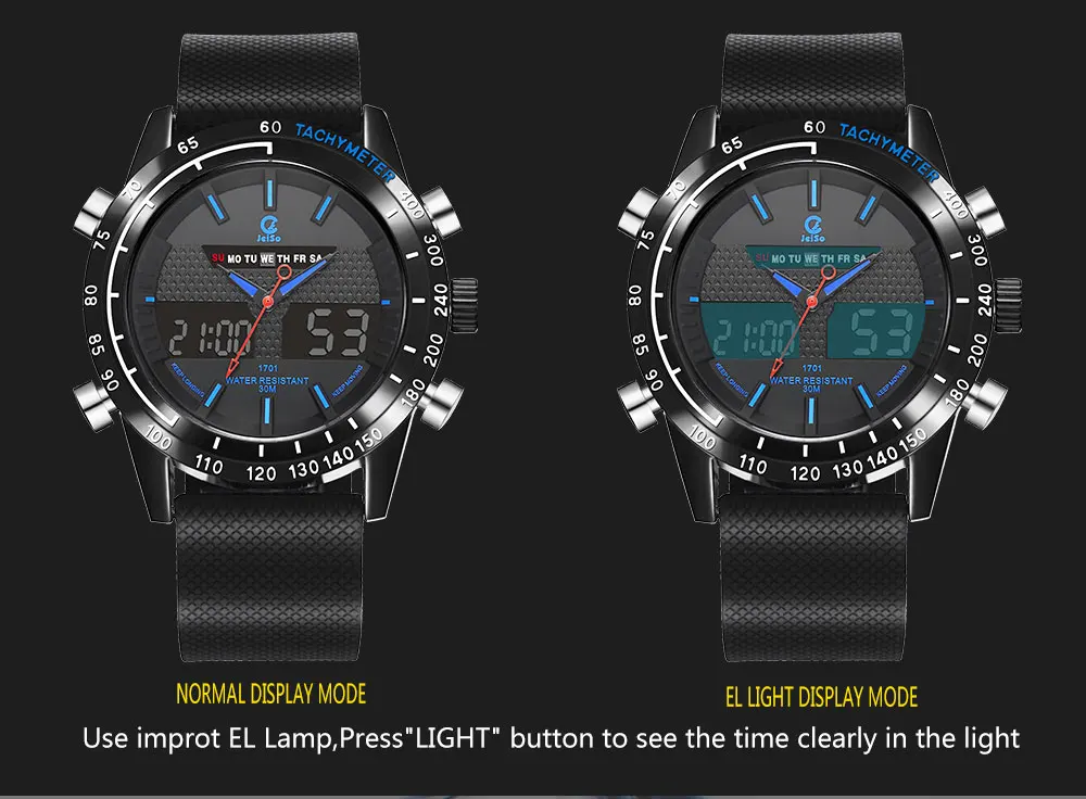 Feature:Water Resistant,LED display,Back Light,Week Display,Alarm
