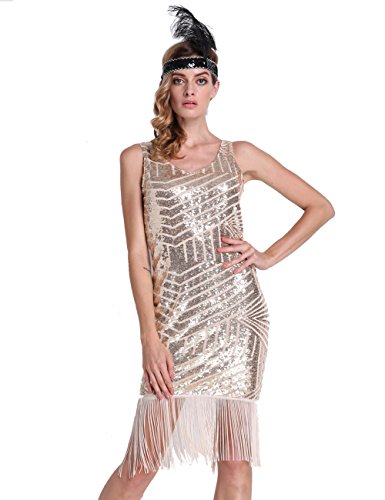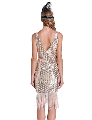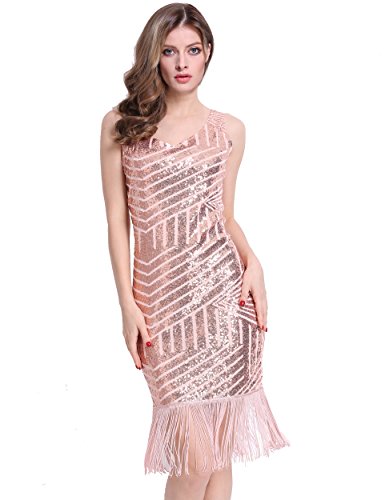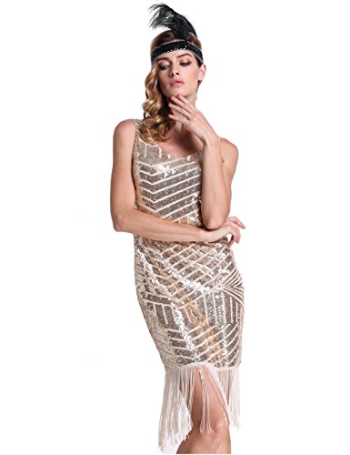 PrettyGuide Women Backless Sequin Geometry Tassel Hem Midi Flapper Cocktail Dress Beige L