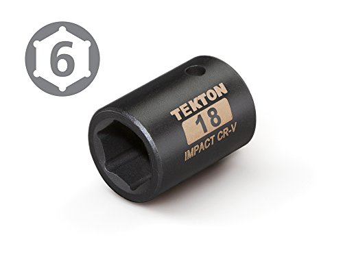The TEKTON 1/2 in. Drive x 18 mm Shallow Impact Socket is engineered for use with impact drivers. It has a 6-point opening that snugly fits the hex shape of fastener heads, allowing it to apply maximum torque without slipping. To prevent round-off under stress, it grips the flat sides of fastener heads rather than the corners. Easy to read even in low light, the large, high-contrast size marking is permanently laser etched into the steel surface. The through-hole in the drive end locks onto the tang of impact wrenches or drivers so it won't fall off or stick on fastener heads. To protect against rust and corrosion, the black phosphate finish absorbs and holds oil, repelling moisture.