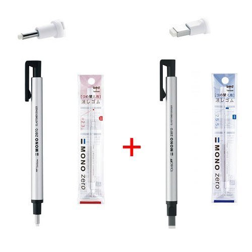 Tombow MONO Zero Pen-Style Eraser Refill Round Tip + Square Tip + 4 Refills (Silver Barrel)