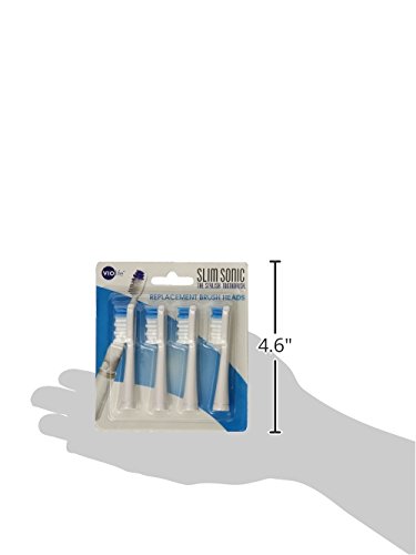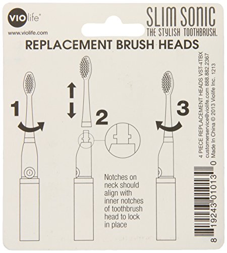 -. Binding : Health and Beauty -. Brand : VIOlife -. Color : White -. Department : Face & Oral Care -. EAN : 0819243010130 -. Feature : Each replaceable brush head will last for six months / Removes more plaque than a manual toothbrush and safe to use on all dental work / Personal care meets personal style / One year limited manufacturer warranty against defects / Package contains four heads / Replacement bristles fit slim and pocket sonic toothbrushes / Fading blue bristles let you know when it's time for a new head / Bristles are medium weight / Recommended for optimal sonic cleaning -. IsAdultProduct : 0 -. Label : Violight LLC -. Manufacturer : Violight LLC -. Model : VST-4TBX -. MPN : VST-4TBXWH -. PackageQuantity : 1 -. PartNumber : VST-4TBXWH -. ProductGroup : Beauty -. ProductTypeName : BEAUTY -. Publisher : Violight LLC -. Size : 4 Pc Set -. Studio : Violight LLC -. Title : Violife VST-4TBX Slim Sonic Travel Toothbrush Replacement Brush Heads, 4 Pack VST-4TBX, White, 1.5 Ounce -. UPC : 819243010130