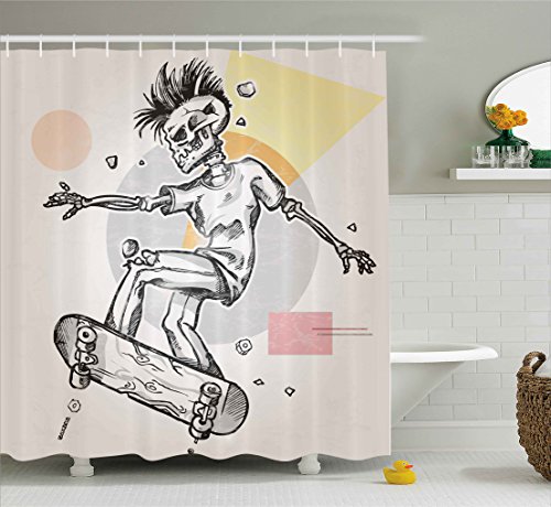 Skull Decor Shower Curtain by Ambesonne, Punk Rocker Skeleton Boy on a Skateboard Skiing with Abstract Background, Fabric Bathroom Decor Set with Hooks, 70 Inches, Light Grey and Cream