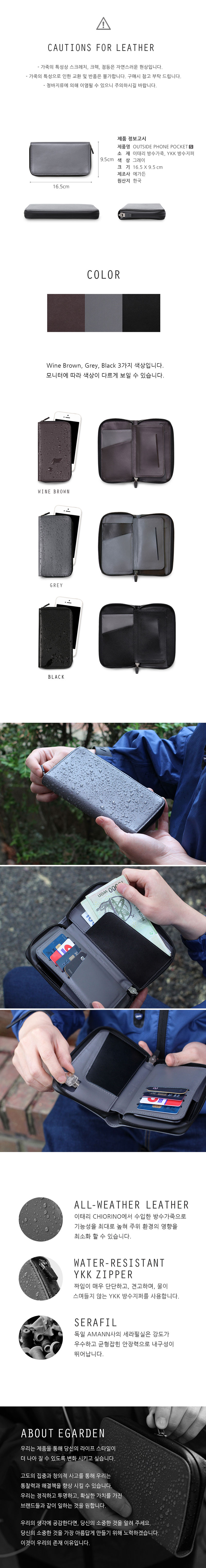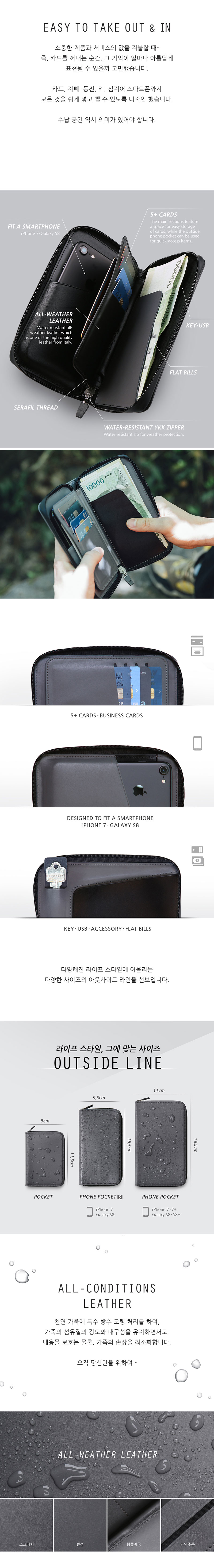 방수지퍼와 방수가죽으로 어떠한 상황에서도 보호되는 지갑.