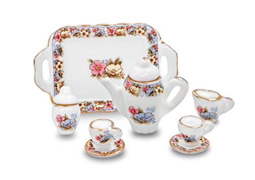 -. Feature : 1/12 scales dollhouse miniature tea set 10pc / Includes: teapot w/ lid,2 dishes and cups,sugar w/ lid,creamer and tray / Our quality collectible miniatures are the perfect addition to your dollhouse,miniature scene or classic setting / Perfect overall pink floral theme design with lovely gold trim border design,lids are removable / Made from fine porcelain and excellent hand-embellished workmanship,completes the dollhouse necessities in chic style.