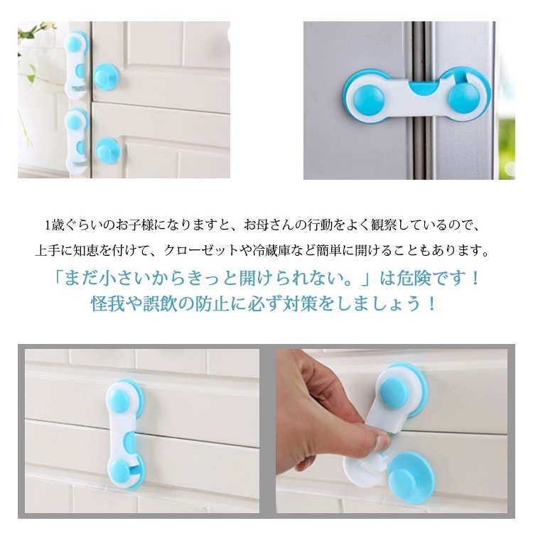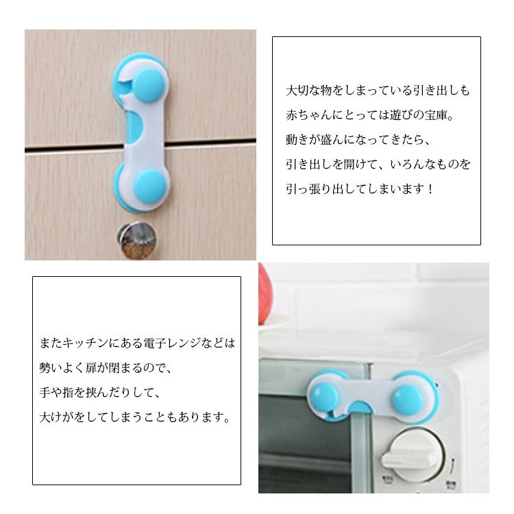1歳前後から~2歳頃の赤ちゃんが大好きな遊び!キッチンにいるお母さんの足元でガサゴソガサゴソ・・・気付いたら物が散乱してた!!!なんてことありませんか?どうってことないものならいいのですが、包丁を間違って出しちゃったりなんかしたら大変です!カチャッとするだけの簡単ストッパー!赤ちゃんやペットのいたずら防止、大きな地震の際に食器棚やキッチンの引き出しが開かないように!地震対策にもオススメです! 本体サイズ縦 約10cm×横 約3.8cm×厚み 約1cm平置きでの計測です。多少の誤差はご了承下さい。