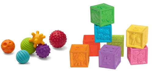 Infantino Textured Multi Ball Set includes four adorable ball pals with lots of sensory stimulating textures for little hands to explore. Comes with Squeeze & Stack Block Set. This colorful set is full of play possibilities. 8 blocks feature a different engaging sight on every side and the reusable grab-and-go tote bag is perfect for travel.