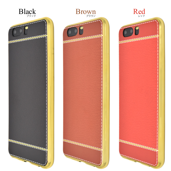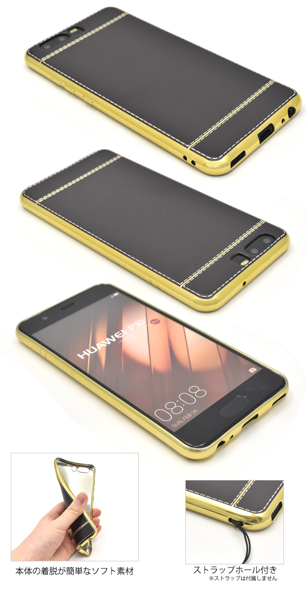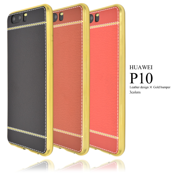 HUAWEI P10用のレザーデザイン×ゴールドバンパーケース。