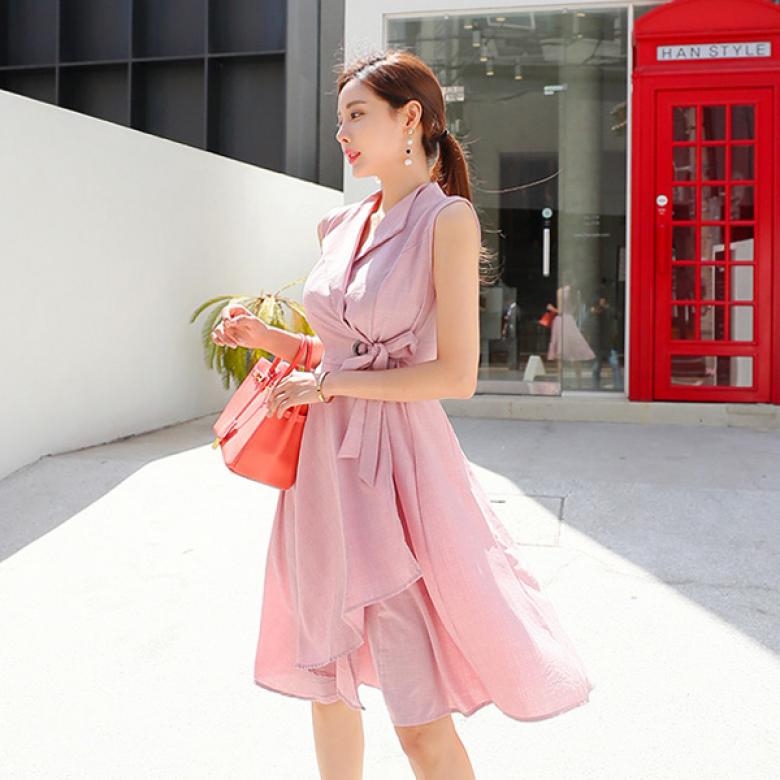 단정한 브이넥 카라 네크라인으로 제작되었구요, 슬리브리스 디자인으로 어깨라인을 살려주는 원피스에요^^ 안정감 있는 A라인 실루엣을 연출해준답니다.