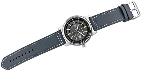 -. Feature : Case / bezel: Ion plated / Leather Band - Mineral Glass / 50M Water Resistant / Size of case : 52.5×45×9.5mm / Silver Dial Grey Band