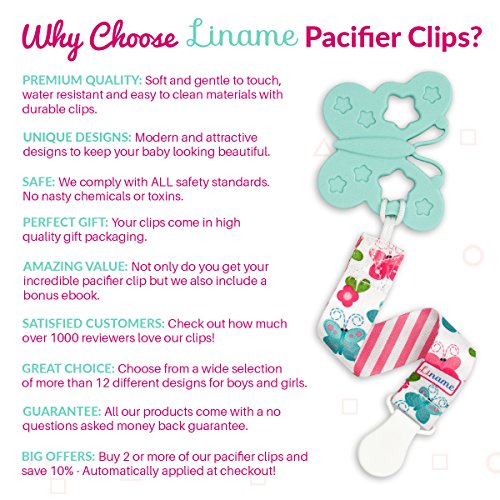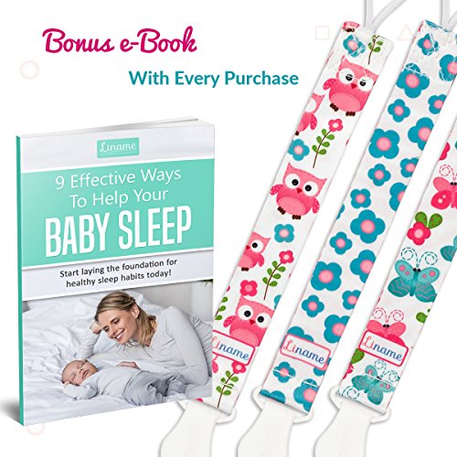 -. Binding : Baby Product -. Brand : Liname -. Color : Pink Owls -. EAN : 0761792295844 -. Feature : ✿ AMAZING VALUE FOR MONEY: Each super cute set includes 3 pacifier clips and a BONUS eBook - that's Amazing value for money! Because Liname clips come in a nice GIFT PACKAGING they are also a perfect baby gift! / ✿ BEST QUALITY & UNIQUE DESIGNS: Parents love that the pacifier clips are made out of washable, durable, high quality material which is very soft to touch. The clip is strong and durable with plastic teeth and won't damage your baby's clothes. Liname baby pacifier clips have unique designs in modern colors and look great at all times. Unlike other brands our Liname pacifier clips have no nasty labels sewed on the strap to irritate your babies skin. / ✿ UNIVERSAL FIT & MULTI PURPOSE: Our pacifier clips will connect to all kinds of soother or pacifier (with or without a ring). They are also perfect for teething toys, baby blankets and drool bibs so your favorite items will always be held safe and sound. / ✿ SAFE FOR YOUR BABY: You can rest in the knowledge that all our products comply with CPSC safety standard, are leads and phthalates free. / ✿ 100% SATISFACTION GUARANTEED: Customer satisfaction in our first P.R.Iority! We are so sure you will love your Liname Dummy Clips that it is backed with a 100% money back guarantee. If you are unsatisfied in any way we will refund your money with no questions asked! -. IsAdultProduct : 0 -. Label : Liname -. Manufacturer : Liname -. Model : klo678 -. MPN : klo678 -. PackageQuantity : 1 -. PartNumber : klo678 -. ProductGroup : Baby Product -. ProductTypeName : BABY_PRODUCT -. Publisher : Liname -. Studio : Liname -. Title : Liname Pacifier Clip for Girls with BONUS eBook - 3 Pack Gift Packaging - Premium Quality & Unique Design - Pacifier Clips Fit ALL Pacifiers & Soothers - Perfect Baby Gift -. UPC : 761792295844