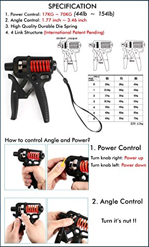 Steel and hard plastic part construction, providing a lasting and powerful adjustable gripper at an reasonably priced price Four Link structure provides muscle development of not only the fingers and the hands but also from the wrist down to the elbow.