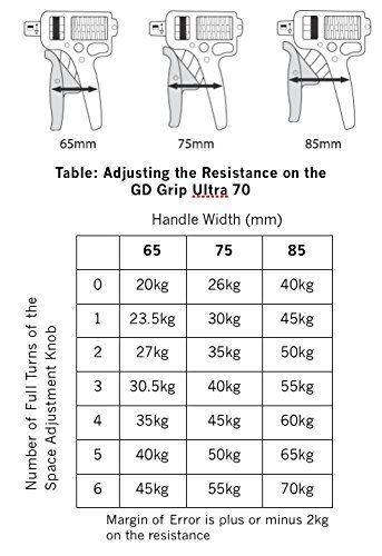 The GD Grip Ultra 70 is a top of the range, adjustable hand gripper developed for professional athletes and everyone else. The resistance can also be adjusted between 20 and 70kg (44 to 154 pounds). Its care for width is adjustable between 45 to 85mm. These combinations enable the user to make a choice from 17 different resistances.