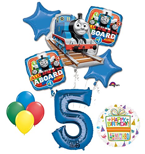 -. Feature : (1) 30" Thomas Engine 1 Foil Shaped Balloon / (1) 34" Giant Blue Number 5 Foil Shape Balloon / (1) 18" Birthday Present Balloon / (2) 18" Square Thomas the Train Foil Balloons / (2) 19" Blue Star Shaped Foil Balloons and (4) 11" Qualatex Latex Balloons 1-Red, 1, Blue, 1-Yellow and 1- Green. All Licensed Foils and Latex MADE IN USA