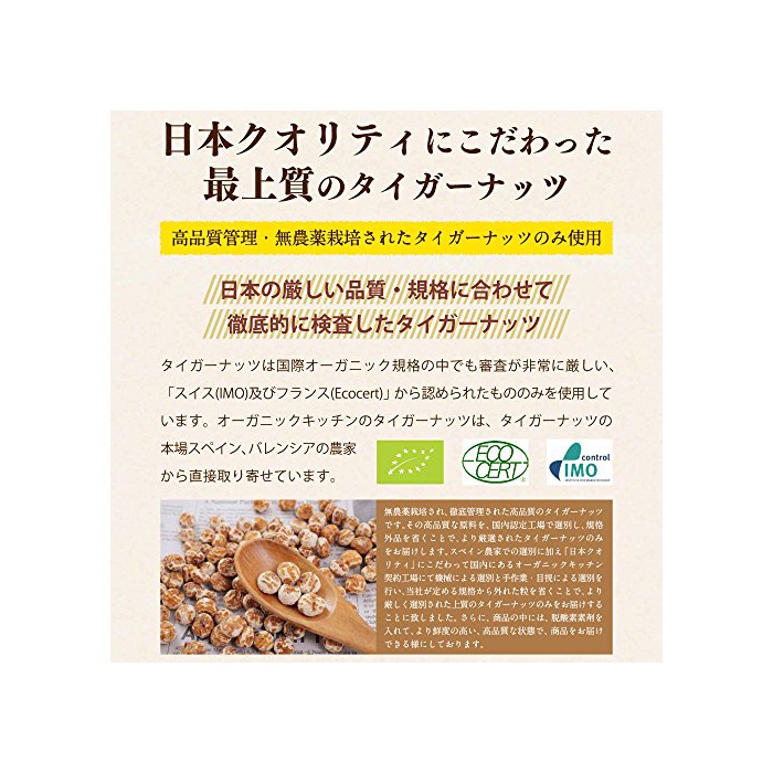 어렴풋이 달콤하고, 향기로운 O 갈 라 이프의 인기 상품이,한층 더 파워 업 했습니다!엄선한 원료를,일본 퀄리티로 한층 더 구애되고, 상질의 타이거 너트를 만들었습니다.오거닉 작물의 국제적 인증 기관인 스위스의 IMO나 프랑스의 Ecocert(에코 서《도》)의 인증을 얻어 있는 진품의 타이거 너트 농집에서 만들어진 원료를 사용 하고 있습니다.