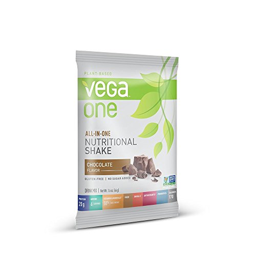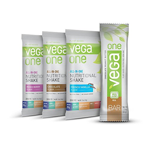 -. Feature : Contains 4 servings: 3x Vega One Single Packs (Vanilla, Chocolate, Berry), and 1x Vega One Meal Bar (Chocolate Peanut Butter) / 20g protein per shake, 6g protein per bar / Packed with protein, fiber, Omega-3s, vitamins, minerals, antioxidants, probiotics, and greens / Shake has 50% daily intake of vitamins and minerals made from fruits and veggies / All Vega One products are Vegan, Non-GMO, and Gluten-free