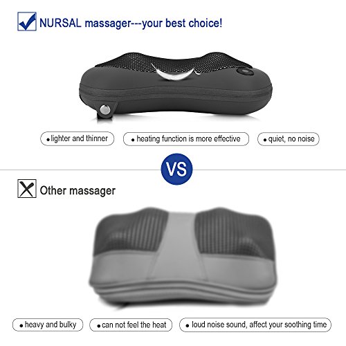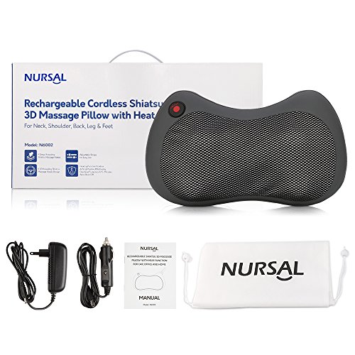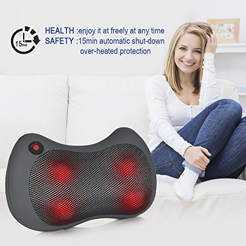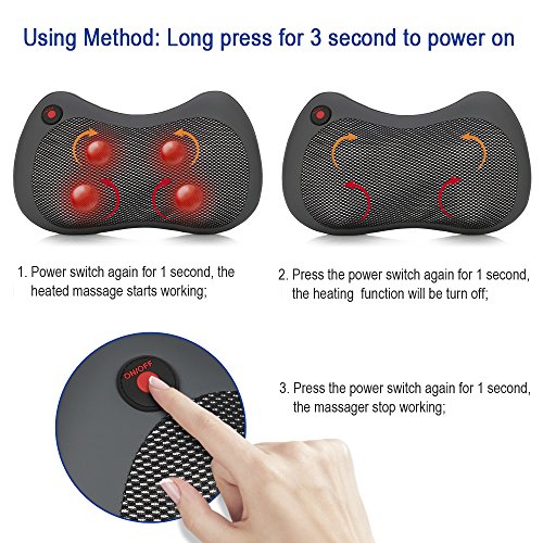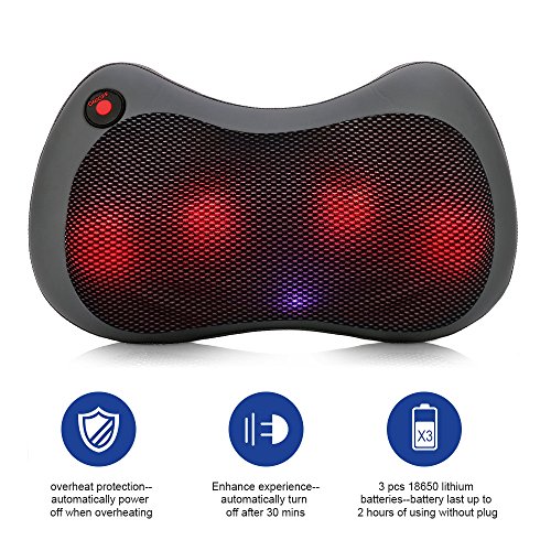 Product Features: Rechargeable lithium-ion battery holds enough power for 2 hours of use. One-button switch control. Heat function helps to give a soothing and relaxing massage. Easy to attach the massager on your favorite chair or car seat. Easy to adjust the intensity and angle of pressure. The sleeker appearance and lighter weight give you more comfort. Convenient to use at home or the office and indoors outdoors. Great to take with you on a trip too. Automatic shut-off after 15 minutes and overheated protection. We provide a 3 -year warranty and friendly, easy-to-reach customer service. Use the massager regularly but not more than once or twice per day! A caring gift for your parents, friends or family.