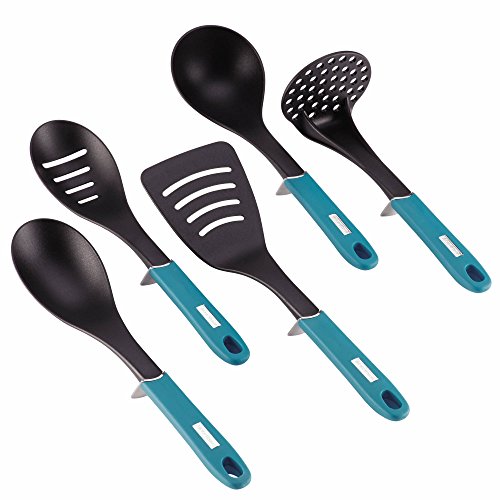 -. Feature : Featured in chilli red / Includes: soup ladle, veggie masher, a solid and slotted spoon and a slotted turner / BPA-free plastic handle cores / Heat safe to 400 and deg;F / Soft-grip handles