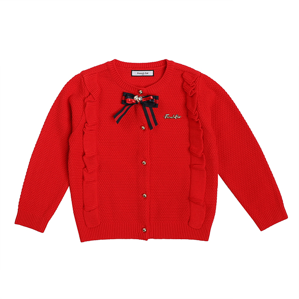 상품설명 레드컬러의 니트 가디건입니다. 앞라인 프릴과 스트라이프 리본 장식이 고급스러운 느낌을 줍니다. 간절기에 입히기 좋으며, 스커트에 코디하시면 특별한 날 외출복으로도 좋습니다