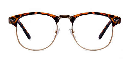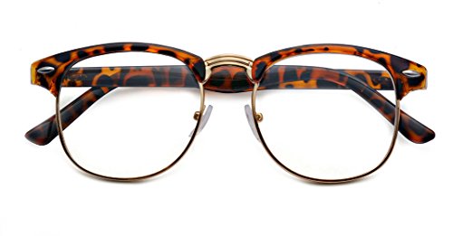 Classic horn rimmed half frame that features clear lenses for a sharp sophisticated look. An iconic frame that will have you looking fashionable in any situation. Frame is made with tortoise shell acetate brow and arms, metal wire lens lining and metal nose bridge. Also made with metal hinges, English style nose pieces and clear UV protected lensesFeature