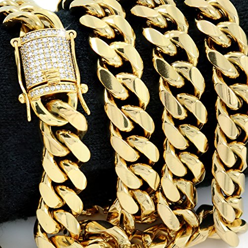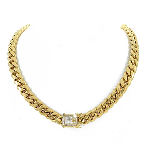-. Binding : Jewelry -. Brand : HarlemBling -. Department : mens -. Feature : Miami Cuban Link Chain. Solid and heavy! 200 Grams! 100 Micropave Hand-Set VVS Lab Diamonds In Clasp - 1ct TW / 5X ELECTROPLATED WONT CHANGE COLOR - 18k Gold Over Stainless Steel! Hypoallergenic: 100% safe to wear as it is lead free and nickel free; never worry about turning your neck green. / Never fades color... Chlorine pool and saltwater safe! WILL LAST FOR YEARS! / SATISFACTION GUARANTEED! -. Label : HarlemBling -. Manufacturer : HarlemBling -. ProductGroup : Jewelry -. ProductTypeName : FASHIONNECKLACEBRACELETANKLET -. Publisher : HarlemBling -. Studio : HarlemBling -. Title : 12mm 30" Cuban Link Chain - 1ct Lab Diamond Clasp - 18k Gold Plated Stainless Steel - Iced Out Bling