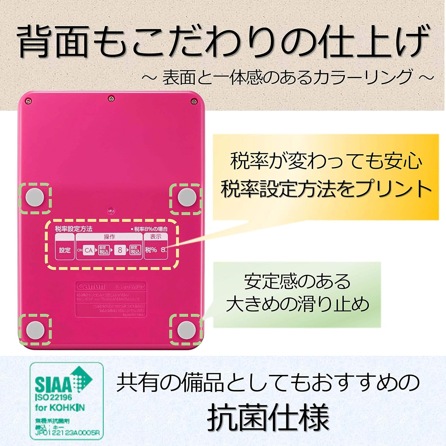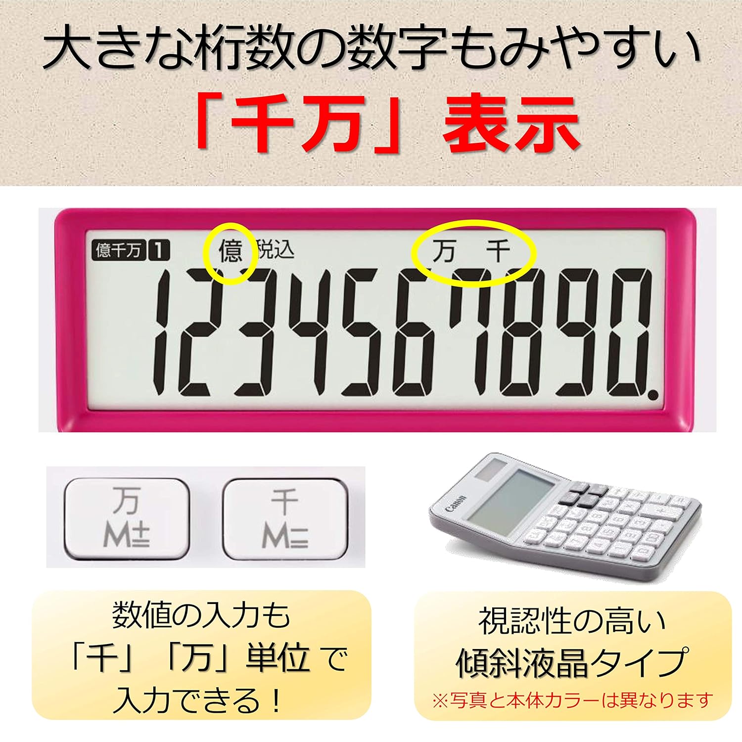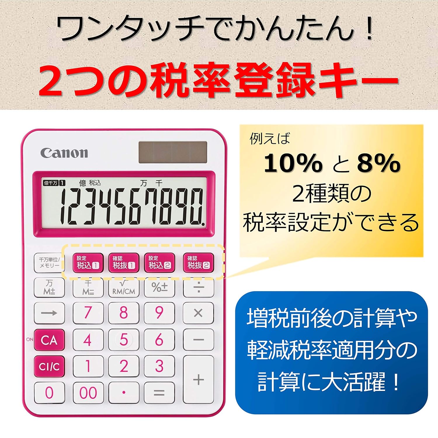製品概要:華やかなホワイトとのツートンカラー。10桁ミニ卓上電卓。