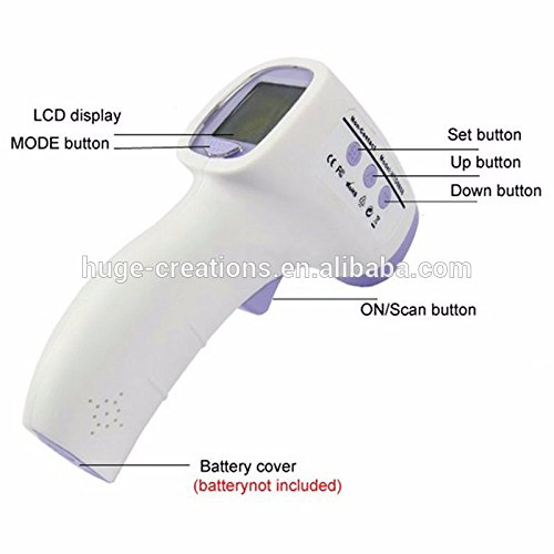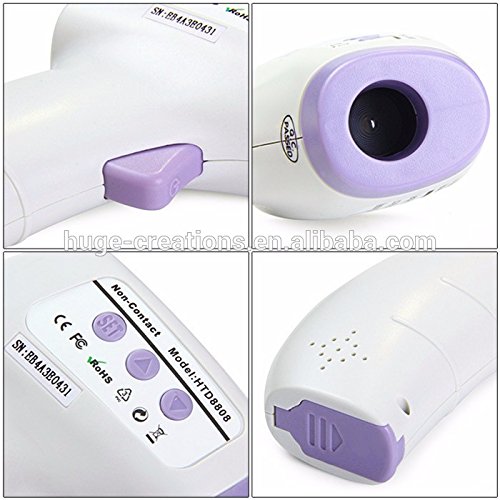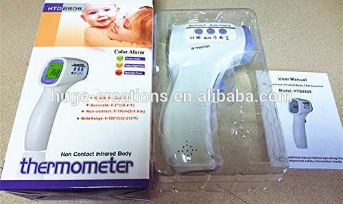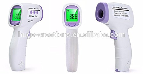 Studio : Huge Creation Publisher : Huge Creation Binding : Health and Beauty Product Description Difference price for carry bag. Display: LCD Display, Resolution is 0.1°C Sound Alarm: Fever Alarm or Beep Alarm when System Problems Happened or Temperature Exceeds Measuring Range. Unit: °C/F can be Changed by Pressing Button. Memory:50 Memory Storages Test Mode: Non-contact Testing Forehead Temperature with 5-15cm Distance Measure Time: One Second. Auto Shut-off: 7 Seconds without Operation Battery: "AA" size battery x 2 Battery Life: Appro.5,000 Times, Inspect Low Voltage of Battery any Time. Can also be used for testing Animal/pets body temperature. Voince selectable Advantage Non-contact Testing Forehead Temperature, Safe and Clean, Slight/High Fever Alarm, Three-color backlight (color alarm), 50 Memory Storages, Alarm Temperature can be Set. can be also for temperature of milk, bath water room and more Slight and high fever alarm Certifications: CE and FCC, RoHS Material ABS plastic 0