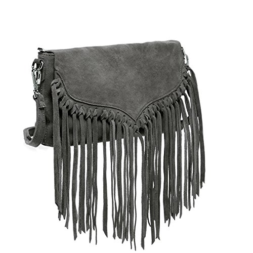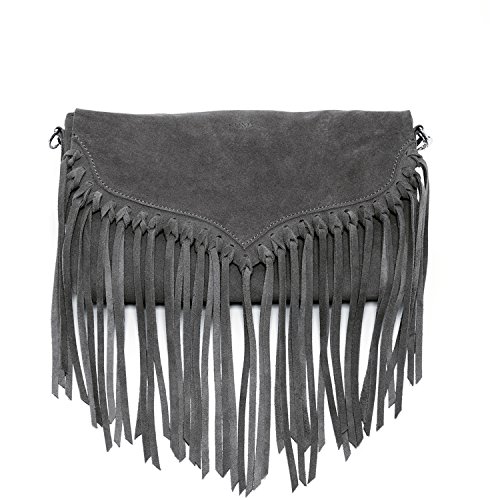 -. Feature : *Width: 10.5 ″ *Height: 6.5 ″ *Depth: 1.3 ″ *Strap Drop: 11-22″ / Suede Leather / Imported / Fabric Lining / Let there be fringe! For the boho woman in you that is ready to embrace the 70s hippie chic revival, the Lillian fits the bill. Made with soft supple suede in brown, black or grey, the Lillian features suede fringe, a fabric-lined interior with a zipped pocket, a cell phone slot, and enough room for all your essentials. Its style is designed to be carried as a clutch or over the shoulder with a removable leather strap.