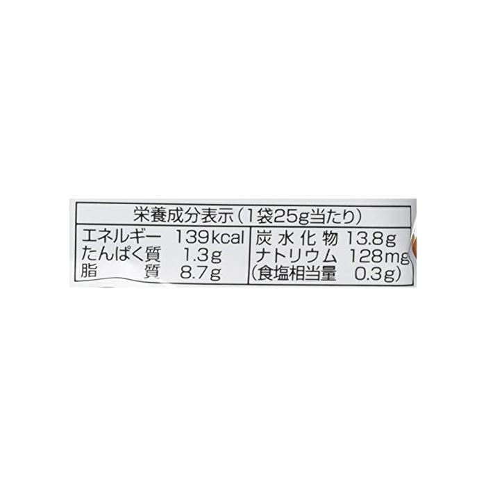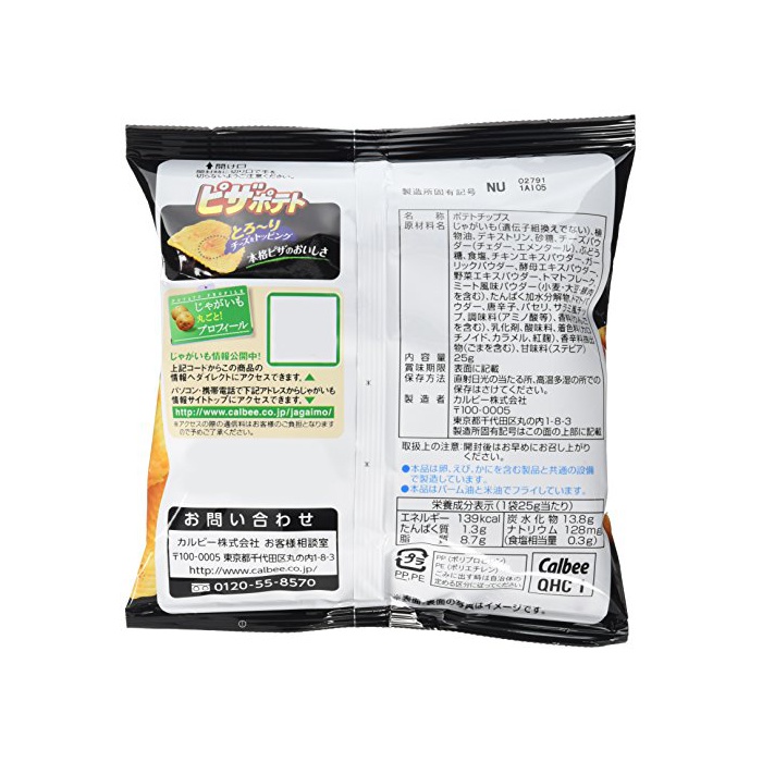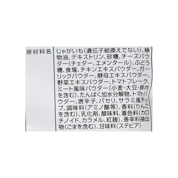 원재료:감자(유전자조 교환 나오지 않는다).식물성 기름.당류(유당,설탕,# 어떻게(아무리) 당).치즈 파우더(《에멘타》 《―루》,최 다《―》).식염.치킨 엑기스 파우더.덱스트린.마늘 파우더.효모 엑기스 파우더.야채 엑기스 파우더.토마토 flake.미토 향 파우더(밀 대두 돼지고기를 포함한다).담백 가수분해물.토마토 파우더.고추.파슬리.《사라미》풍 팁(칩).조미료(아미노산등).향료(사과를 포함한다).유화 제.신맛료.착색료(카로 치노 이 드,카 라메《루》,홍누룩).향신료 추출물.감미료(스테 비어)