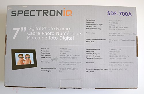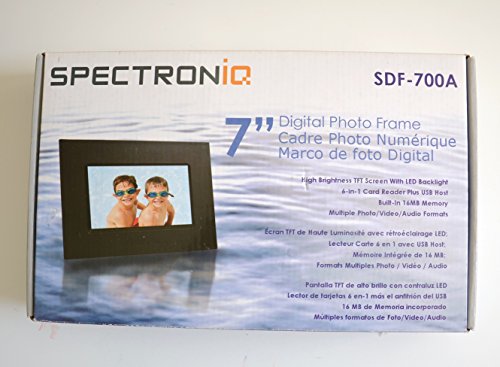 -. Binding : Electronics -. Brand : SpectronIQ -. EAN : 0897998111043 -. Feature : Connect to computer as card reader. / Built-in 16MB flash memory / Display photos taken by most digital cameras / Support JPG photos, WMA music, and videos / Built-in double audio stereo speakers -. Label : Made in China -. Manufacturer : Made in China -. MPN : 111043 -. PackageQuantity : 1 -. PartNumber : 111043 -. ProductGroup : Photography -. ProductTypeName : CAMERA_OTHER_ACCESSORIES -. Publisher : Made in China -. Studio : Made in China -. Title : Spectroniq 7" Digital Photo Frame Sdf-700a -. UPC : 897998111043