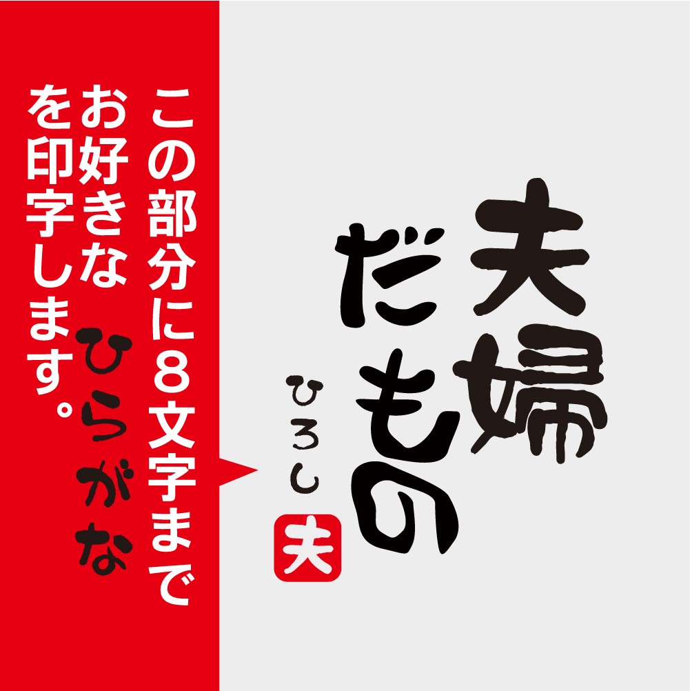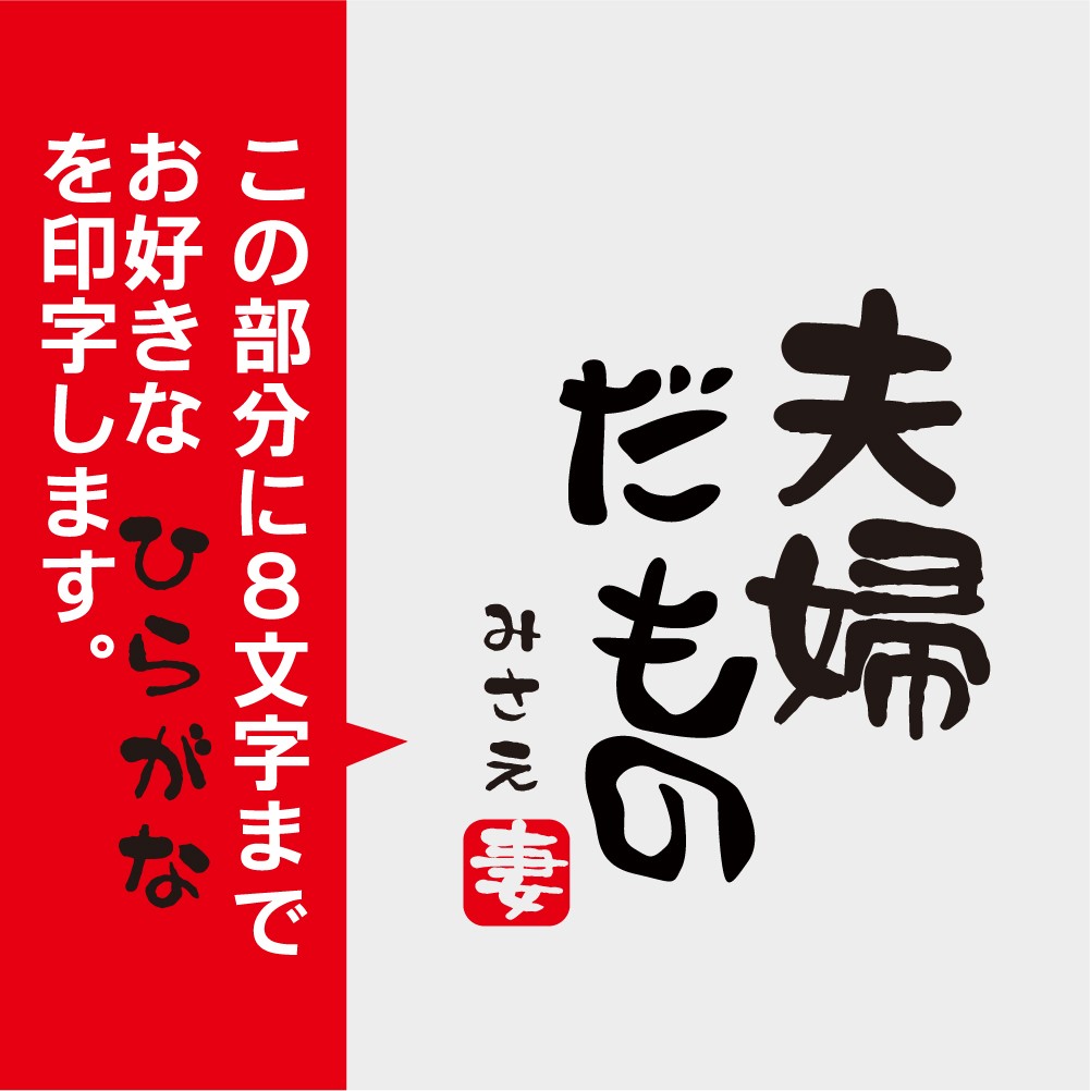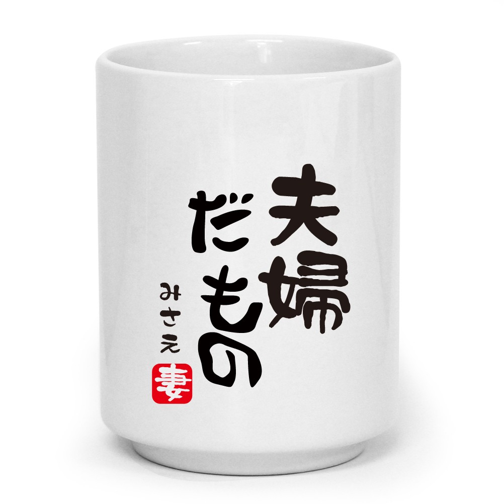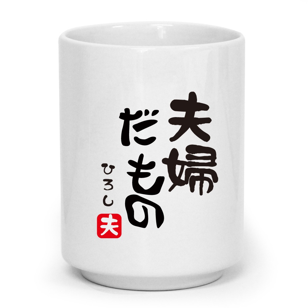夫婦だもの とデザインされた湯呑みです。落款(朱印)部分は「夫」「妻」の2デザインからお選びいただけます。※セット販売ではございません。デザイン部分はインクが浸透しているので、10000回洗ってもたぶん平気です!名入れ可能ですので、プレゼントしたい方のお名前を入れて贈りましょう。 サイズはお寿司屋さんによくある魚漢字がいっぱいの湯呑ぐらいで、ちょっと大きめです。ベースは白色です。 名前の文字は黒文字、書体は筆文字となります。文字数は8文字(ひらがな)を名入れいたします。