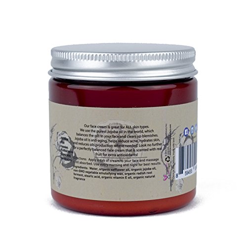 Our face cream is perfect for ALL skin types. We use the purest Jojoba oil in the world, which balances the oils in your face and clears up blemishes. Jojoba oil is anti-aging, helps reduce acne, hydrates skin, and reduces oil production where needed. Look no further for a perfectly balanced face cream that's scented with real fruit for extra antioxidants!Feature