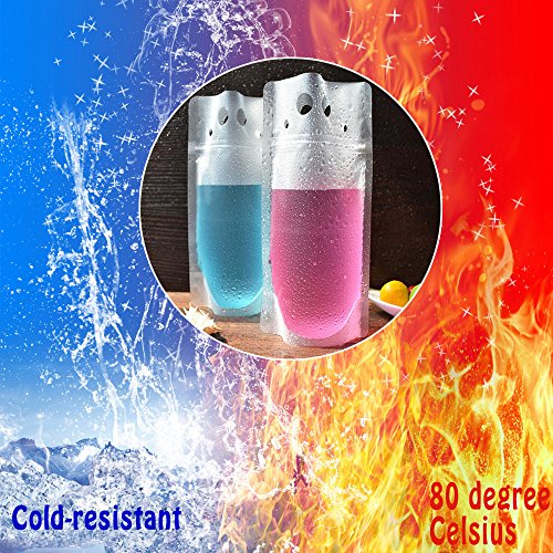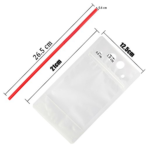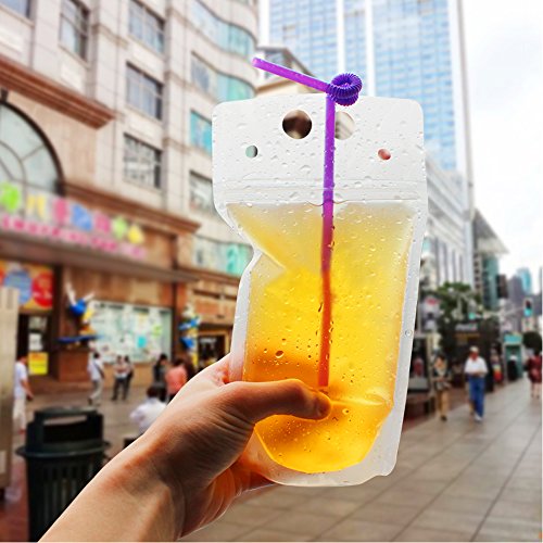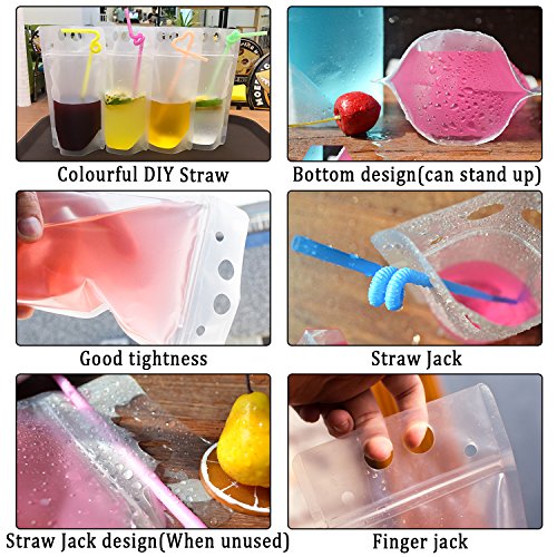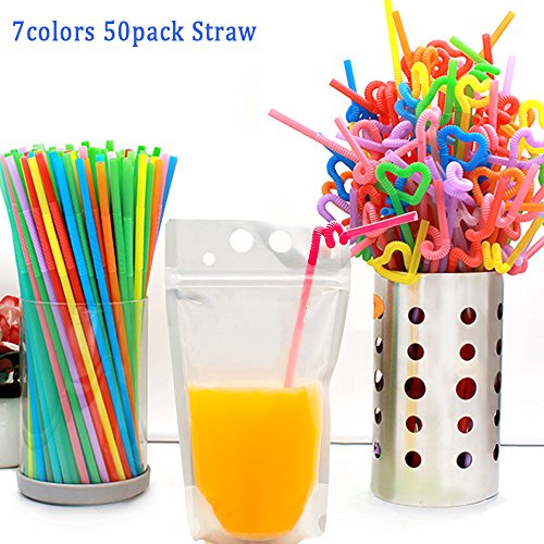 PACKAGE INCLUDES - 50 pcs hand-held stand-up drink bags with 50 pcs colorful straws.