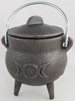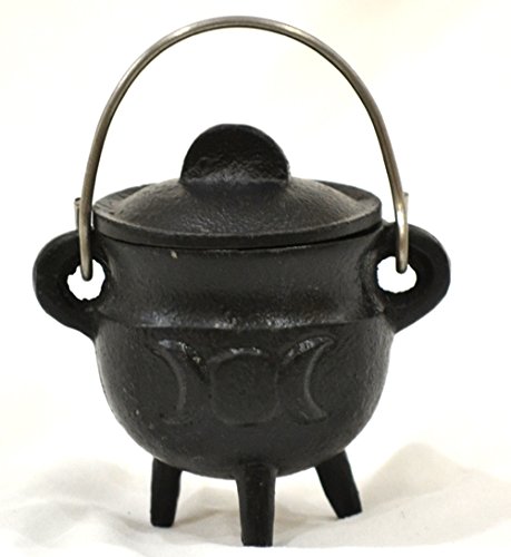 This small, traditionally styled cast iron cauldron features the symbol of the goddess, a triple moon, on opposing faces. The triple moon is said to represent the three faces of the Triple Goddess, or the maiden, mother and crone. These figures are powerful symbols for the cycle of life, and therefore powerful additions to the cauldron, which is often used as a ritualistic symbol of rebirth and creation itself. The cauldron itself measures only 3" high and 2 3/4" wide, and comes with a lid and carrying handle. It measures approximately 2" deep internally, with an internal diameter of approximately 2" wide. This makes for a wonderful place for offerings and a great incense burner.Feature