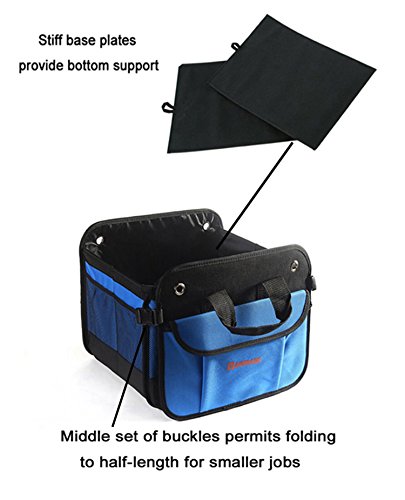 Blue color,super durable 600D oxford polyester fabric,rugged handles,Multiple compartments,expandable mesh pockets,sturdy rubber foot based,Water resistant no sag rubber/nylon bottom is reinforced for your heavy cargo