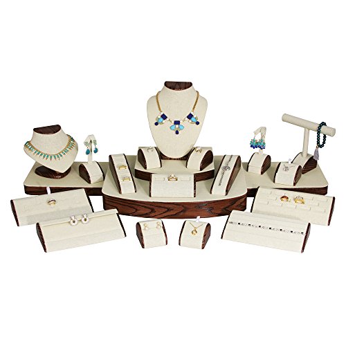 (EDs)/Nursery/Furniture/DIRECT FROM USA/(21-Pc Set) Beige Linen with Wood Pattern Trim Jewelry Display Set (Set60-N33) 37" x 18" x 11 5/8" H