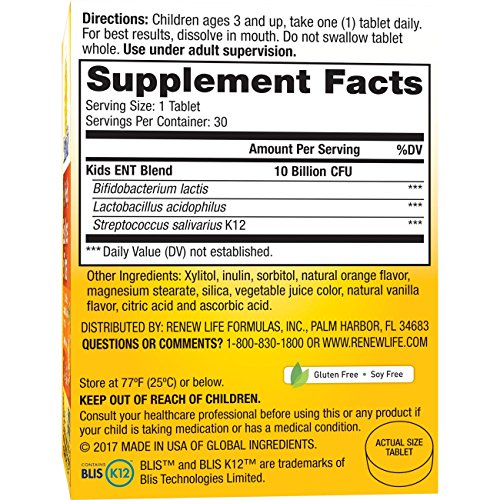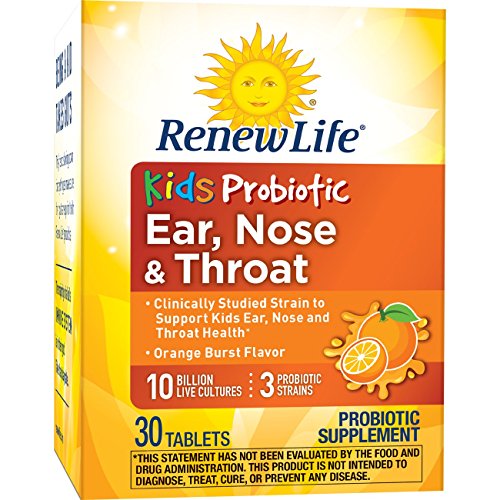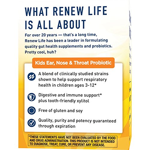 Renew Life Kid's Ear, Nose and Throat Probiotic is a daily chewable probiotic with clinically studied strains and supports children's ear, nose and throat health. These tablets are bursting with orange flavor and contains a blend of clinically studied strains shown to help support respiratory health in kids ages 3-12. Made with 10 billion guaranteed live cultures per serving from three probiotic strains, Ear, Nose & Throat reflects your child's natural gut diversity and supports respiratory health while providing added digestive & immune support. These statements have not been evaluated by the Food and Drug Administration. This product is not intended to diagnose, treat, cure, or prevent and disease.Feature