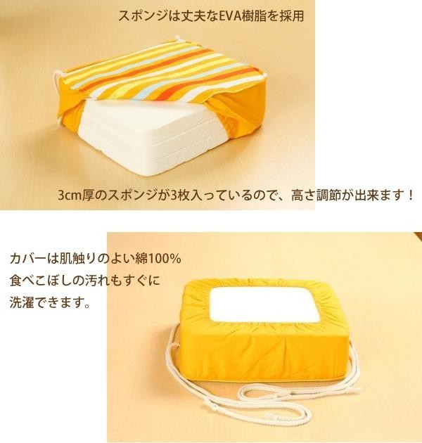 ヒモで固定するので、取り付けカンタンで取り外しもラクラクです。3cm厚のスポンジが3枚入っているので、高さ調節が出来ます。カバーは綿100%で汚れてもすぐに洗えます。スポンジは丈夫なEVA樹脂を採用しています。 |