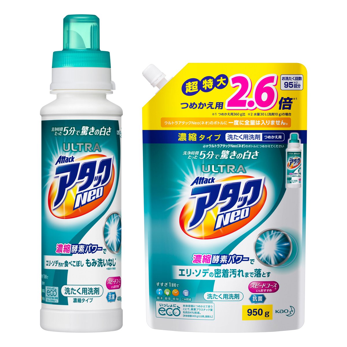 商品紹介 「濃縮酵素パワー」で、エリ・ソデの密着汚れ*も直接塗るだけ、もみ洗いなし。 「スマートキャップ」採用で、気になる汚れ部分に集中的に塗れます。 洗浄時間たった5分でまっ白に洗い上げるから、洗たく時間の短いスピードコースで標準コース同等の洗浄力。 抗菌効果もあります。部屋干しでもニオイが気になりません。 濃縮タイプ液体洗剤。 ドラム式洗たく機にも使えます。 ●蛍光剤無配合 ●すすぎ1回で節水・節電、時短に ●爽やかなリフレッシュソープの香り *雑菌を含んだ皮脂汚れ 【洗たく用洗剤(液体タイプ)】