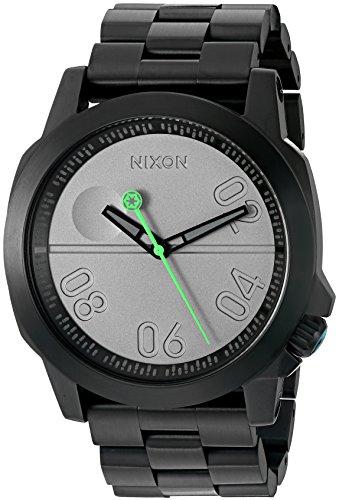 Take your style over to the dark side with the fully operational design of the Nixon® Ranger 45 Sport X Star Wars Collab watch! Miyota Japanese quartz three-hand movement and crown placement at four o'clock. The dial features bold printed indices and seconds track on the concave ring, custom molded hands, and applied 12-hour marker. Dial features debossed dial markers and inner dial ring features Death Star detail with luminous fill. Death Star Marker at 10 o'clock hour marker. Laser cannon seconds hand. Case:• 44 mm, 100 meter/10 ATM custom stainless steel case with hardened mineral crystal• Stainless steel bezel• Custom screw bar lugs• Stainless steel double gasket crown• Stainless steel screw down caseback 24 mm custom injection molded silicone band with a patented locking looper and a solid stainless steel buckle closure. 100 m water rating. Imported. Measurements: Case Height: 39 mm Case Width: 39 mm Case Depth: 10 mm Band Width: 5⁄7 in Band Circumference/Length: 7 in Weight: 3.2 oz This product may have a manufacturer's warranty. Please visit the manufacturer's website or contact us at warranty@support.zappos.com for full manufacturer warranty details.Feature