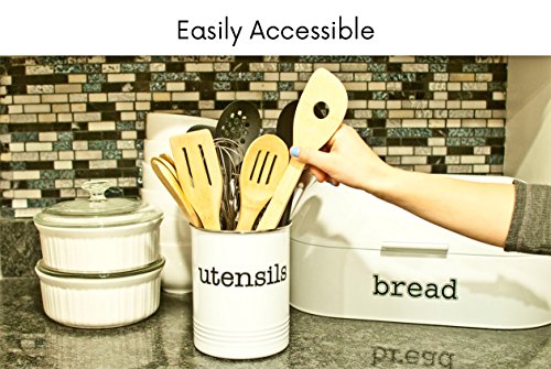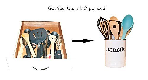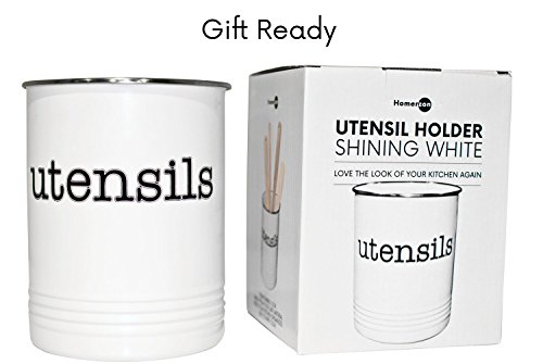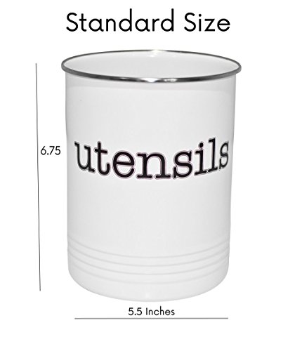 Made from food safe powder coated galvanized steel, this crock is durable and large enough to keep a bevy of your favorite tools at hand. This white kitchen utensil holder is not too small and not too big, just perfect size, measuring 6.75 inches tall and 5.5 inches in diameter. When your kitchen small and you don't have much space to organize, putting all of your kitchen gadgets such as utensils in one place is crucial for being effective in the kitchen. Utensils are not included. Homerzon manufactures useful tools for kitchen 0