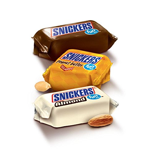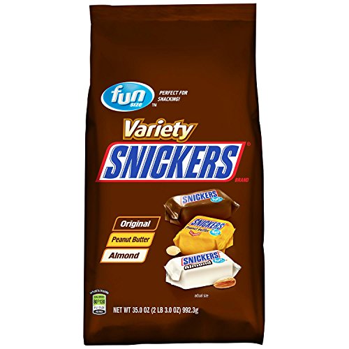 -. Binding : Grocery -. Brand : Snickers -. EAN : 0040000426462 -. Feature : Contains one (1) 35-ounce, 55-piece bag of SNICKERS Fun Size Chocolate Candy Bars Variety Mix / This variety mix contains fun-sized SNICKERS Original, SNICKERS Peanut Butter and SNICKERS Almond Chocolate Bars / Fun size candy bars are ideal to pass out on Halloween night or to bring to your next party / This chocolate variety mix is packaged in a stand-up bag that you can place at the center of any party to share / Share an assortment of SNICKERS Fun Size Candy Bars with friends and family -. IsAdultProduct : 0 -. Label : Snickers -. Manufacturer : Snickers -. Model : 260494 -. MPN : ZQB-10031 -. NumberOfItems : 1 -. PackageQuantity : 1 -. PartNumber : ZQB-10031 -. ProductGroup : Grocery -. ProductTypeName : GROCERY -. PublicationDate : 2011-03-18 -. Publisher : Snickers -. ReleaseDate : 2016-05-09 -. Size : 35-Ounce 55-Piece Bag -. Studio : Snickers -. Title : SNICKERS Variety Mix Fun Size Chocolate Candy Bars 35-Ounce 55-Piece Bag -. UPC : 040000426462
