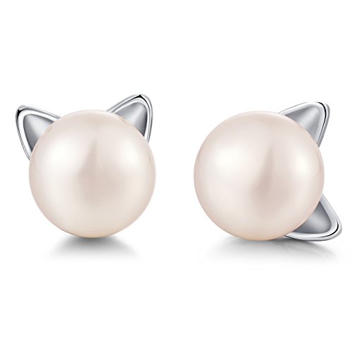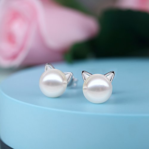 Pearl Cat Earrings,Sterling Silver Cat Earrings,Freshwater Cultured Pearl Earrings,Cat Pearl Earrings 7.5MM,Naughty Cute Cat Earrings,Silver Cat Earrings for Women Girls